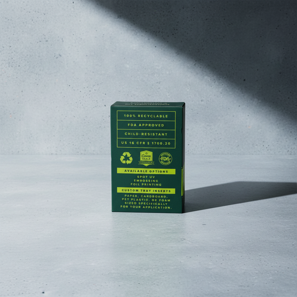 Our child-resistant boxes go beyond standard packaging with custom-molded inserts designed to securely hold pre-rolls, vape cartridges, edibles, and more. Choose from paper, pulp, or plastic inserts, all tailored to your product’s exact specifications for a snug, protective fit.